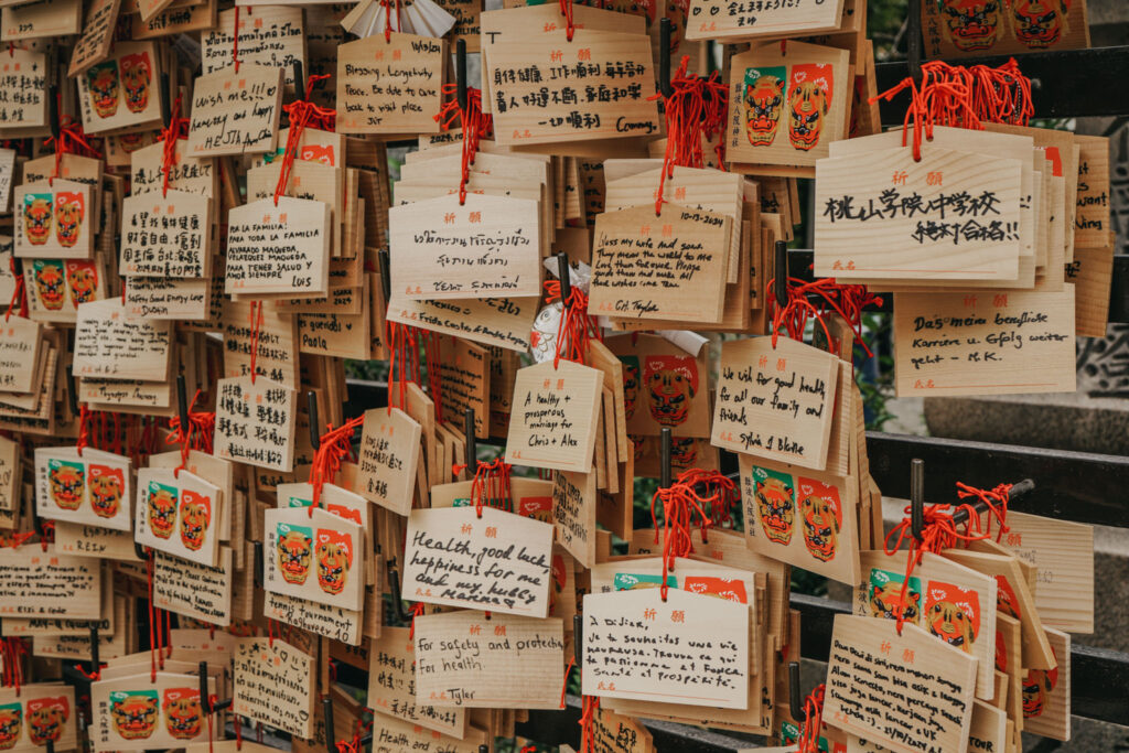 Walking around shrines and temples in Japan, you might notice structures overtaken in hanging plaques. These small wooden panels are called ema and are available for purchase. Each place of worship has their own variety of ema designs that usually feature the animals of the zodiac or what the specialty of the shrine or temple is.
